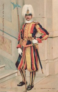 Le Guardie Svizzere hanno una bella uniforme. Non gliel’ha disegnata Michelangelo, come vuole la leggenda, però è bella davvero. Tutta colorata, a spicchi, con quel giallo carico carico e quel meraviglioso blu. Un piacere per gli occhi. Poi son tutti ragazzoni alti e biondi, portano l’alabarda, hanno in testa quell’elmo rinascimentale che pare uscito da un quadro. E vogliamo parlare dei pantaloni a sbuffo? Dico, una meraviglia, roba che Armani ci si rosica le dita a non poterla mettere addosso ai suoi modelli una roba così.