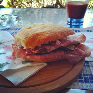 Poi uscire dall’aula, farsi accarezzare dal sole, sedersi al tavolino del baretto da camionisti fuori dalla scuola, con i tavolini sghembi ed i pensionati parcheggiati da tempo immemorabile davanti al loro eterno bicchiere di vino bianco, gli operi rumeni che entrano ed escono e le ragazze cinesi del centro massaggi dietro l’angolo che si siedono, per qualche minuto, di tanto in tanto, per la pausa. Entrare, informarsi se è arrivato il pane fresco e la soppressa con l’aglio, quella buona buona, che il gestore mette via per i più affezionati clienti, ordinarsi un panino zeppo zeppo di quella meraviglia, fregandosene altamente dei trigliceridi e di tutte le scalmane salutiste, e mangiarselo tutto, in santa pace, godendosi ogni singolo boccone come un privilegio.