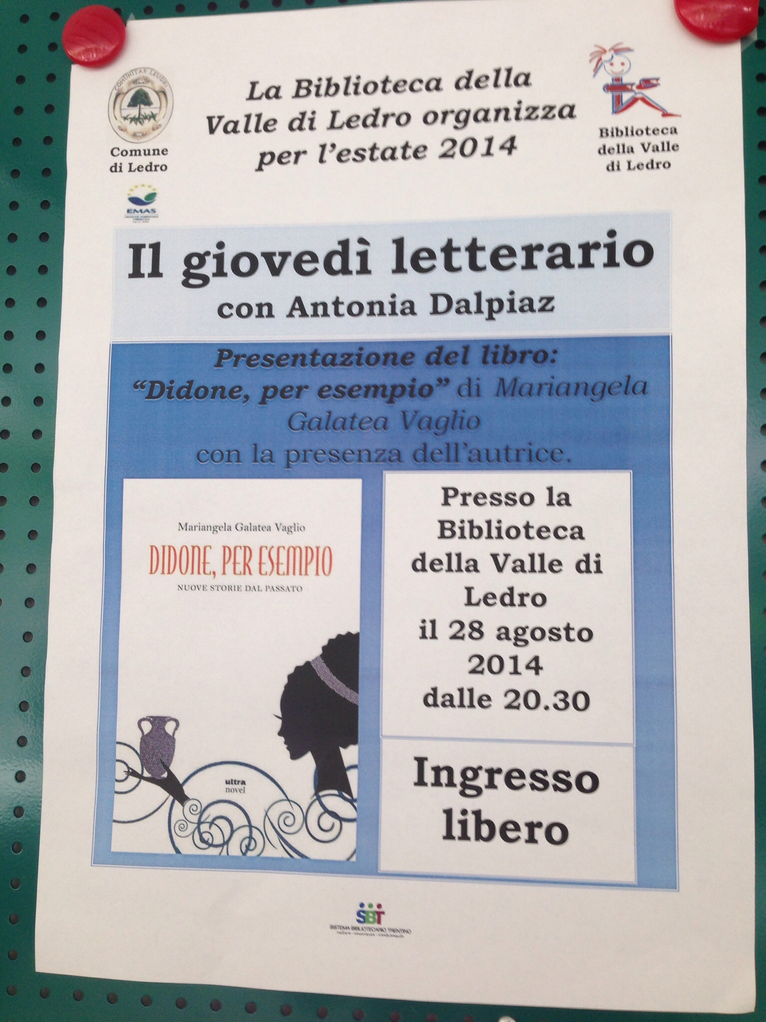 Ah, dimenticavo: se stasera, putacaso, verso le 20.30 siete in Trentino, dalle parti di Bezzecca e della Val di Ledro, e non sapete cosa fare di preciso, in biblioteca a Bezzecca ci sono io che presento Didone, per esempio. Dopo essermi scofanata in tre giorni tutto il mangiabile in Val Di Ledro, ovviamente.