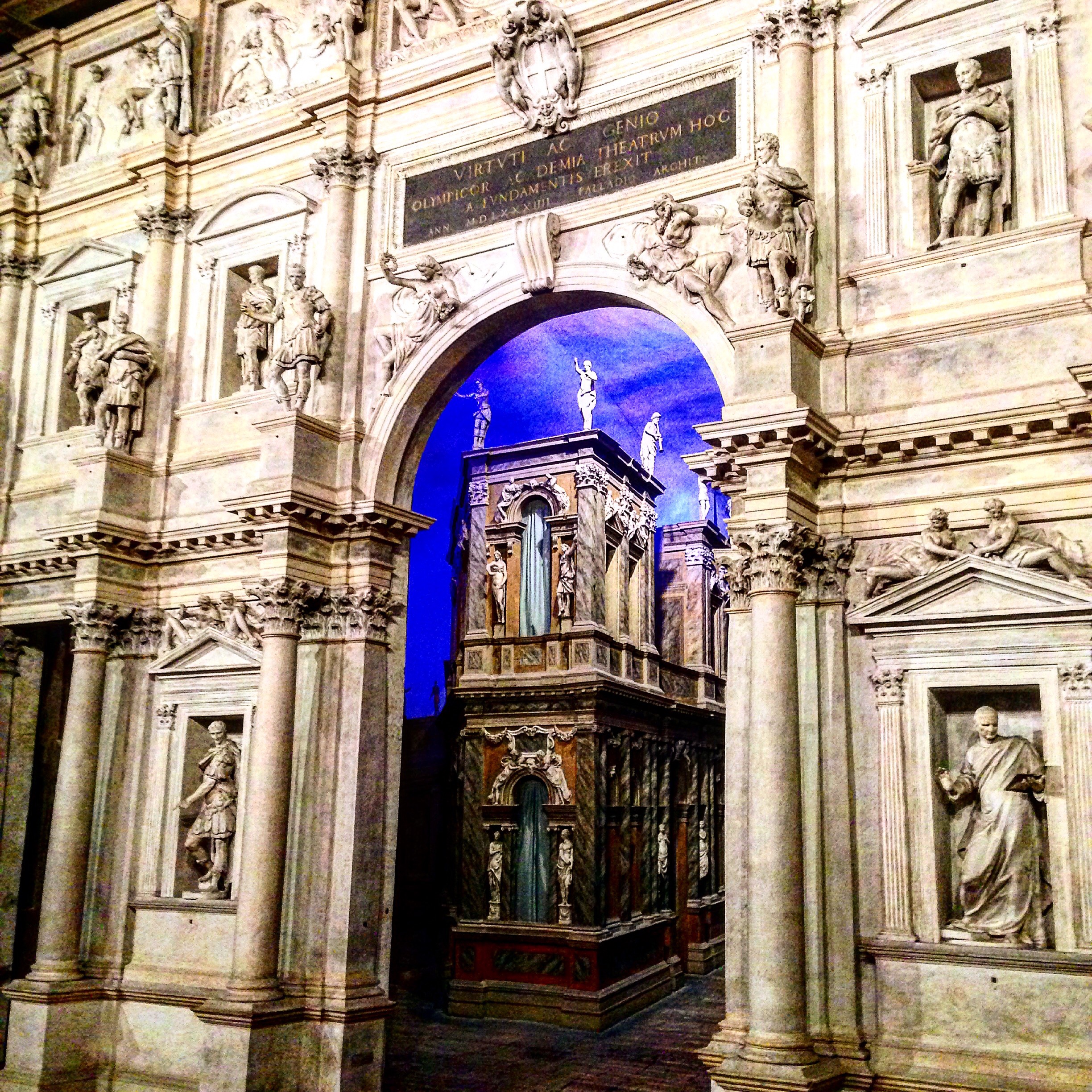 Sono affascinanti questi fili rossi che attraversano i secoli e i millenni, e si riannodano di tanto in tanto, o non si sciolgono mai. E così a Vicenza si entra in saloni con le ampie volte imbiancate ed affrescate da cui occhieggiano gli antichi personaggi del mito ritratti come si ritrarrebbero i vicini di casa: Ercole che bacia Ebe su un letto di morbidi cuscini, Fetonte che cade dal carro e, ritratto dal di sotto, mostra impudico i suoi gioielli al vento, prima di schiantarsi nel Po. Poi dentro quello scrigno meraviglioso che è l’Olimpico, le sette vie di Tebe antica sembrano le vie della città, e la scena e la vita costituiscono un tutt’uno, mentre i turisti di oggi si siedono dove si sedevano gli aristocratici intellettuali del Cinquecento, che emulavano i più antichi Greci e Romani.